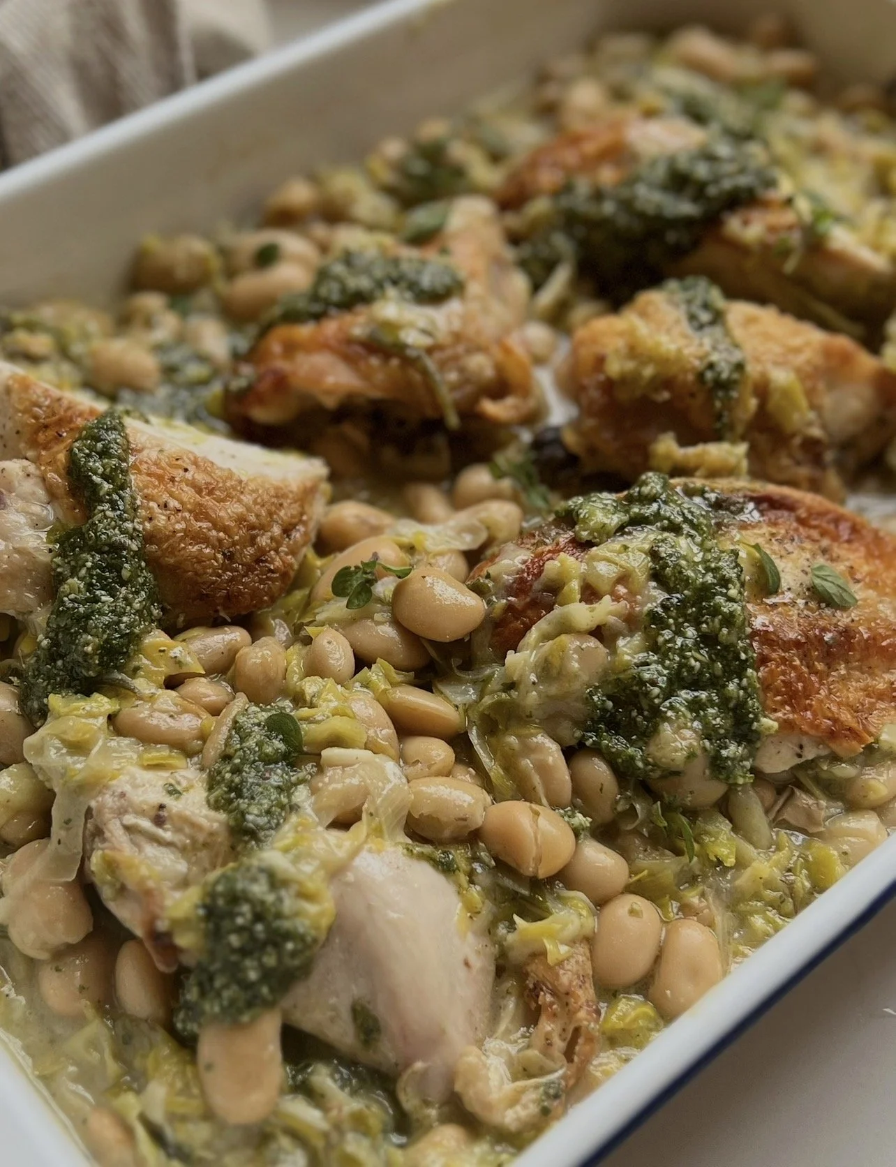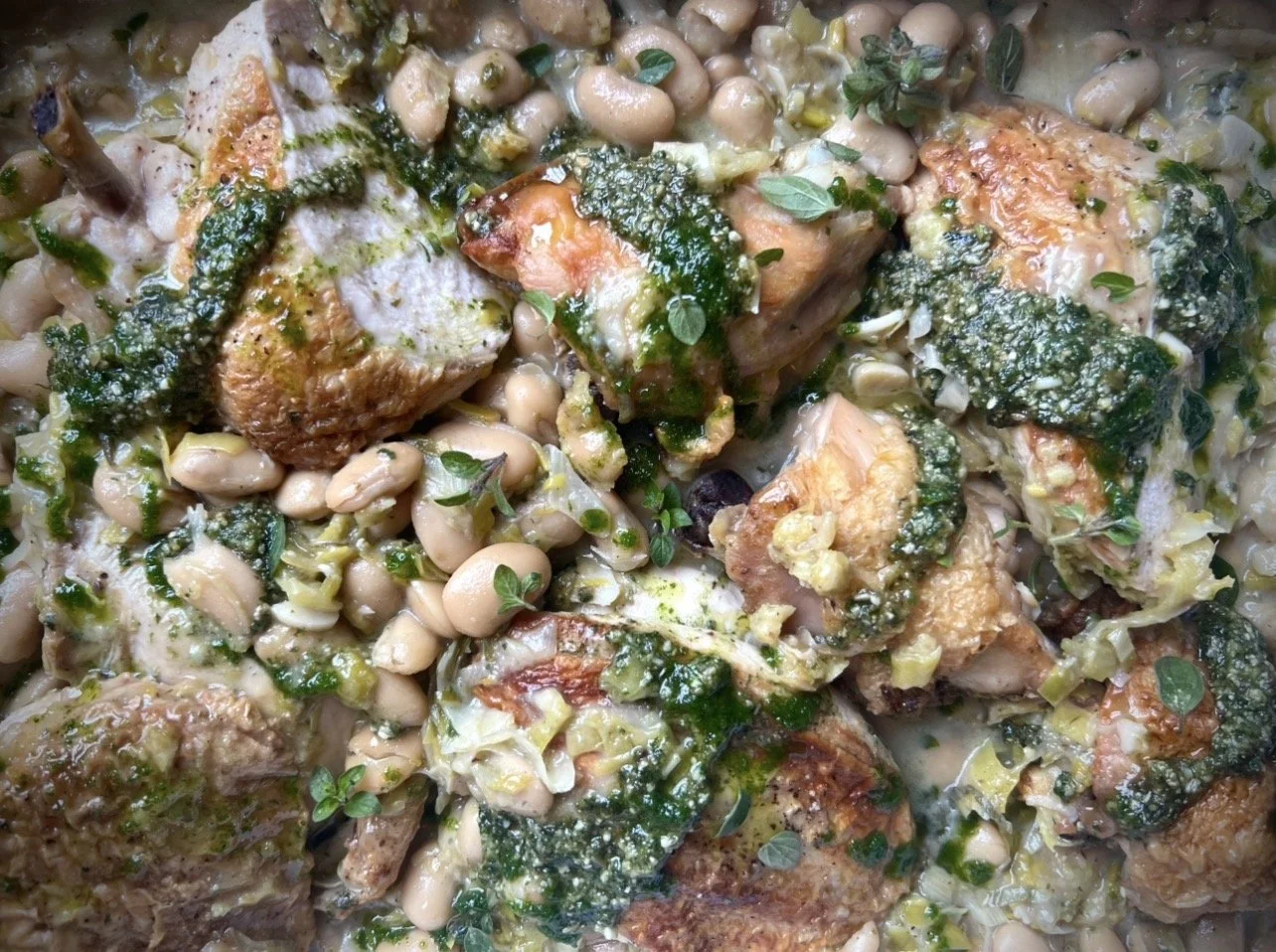 CHEAT CODE: In all honesty, you can skip all of the above, buy chicken stock and simply roast two chickens, carving them up and adding to the leek/beans with the roasting juices- equally delicious